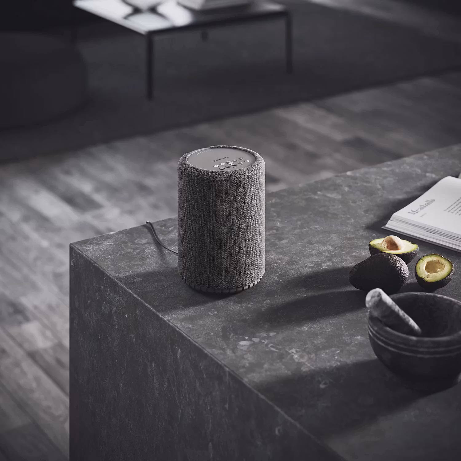 Multiroom-högtalaren A10 MK II är utformad för att passa sömlöst in i alla moderna hem med sin kompakta och rundade design. Tygfronten finns i två nyanser av grått, vilket gör att den smälter in i moderna inredningsstilar utan problem. Trots sin blygsamma storlek levererar högtalaren en imponerande ljudupplevelse, tack vare den dedikerade woofern och BMR-tekniken, som ger djup bas och tydliga hög- och mellanregister.